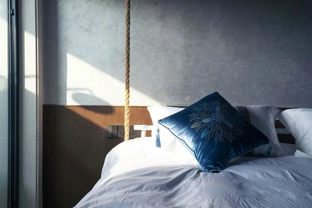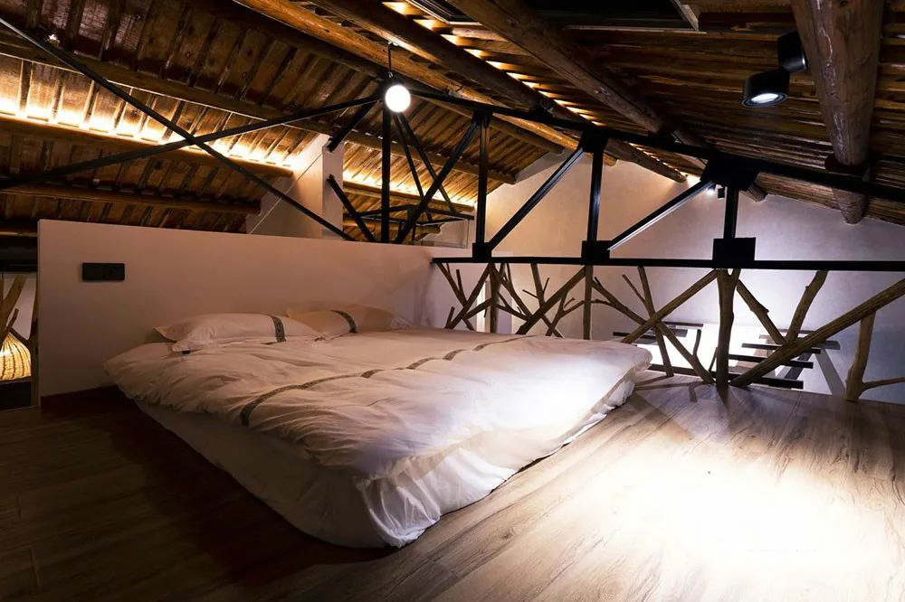 原始建筑5.3m的层高为阁楼的打造提供了一个契机,设计得以超越常规套房模式的独有客房布局,形成三种不同高度的空间平台:一层空间、过渡空间(阅读区)和阁楼空间,极大地丰富了竖向上的空间体验,随着空间标高的增加,私密性逐步增强。每个套间面向的是一个亲密的小团体,因此我们希望室内的空间为人与人的交流互动创造平台与条件。