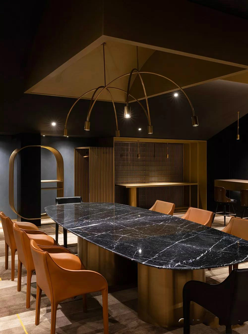 二楼主色调与一楼色调呼应,顶部的几何形块面延伸出条形弧度和线型网格架,虚实有序的敞亮空间将会议区与圆桌就餐区一分为二,使两个功能区域互动式分离,更具空间多样性。包厢区宽敞闲适,管状交叉光源让上半部分金色更为柔和,下半部分的沙发区不显暗沉,品质感的黑色沙发提升了空间的私密和舒适。