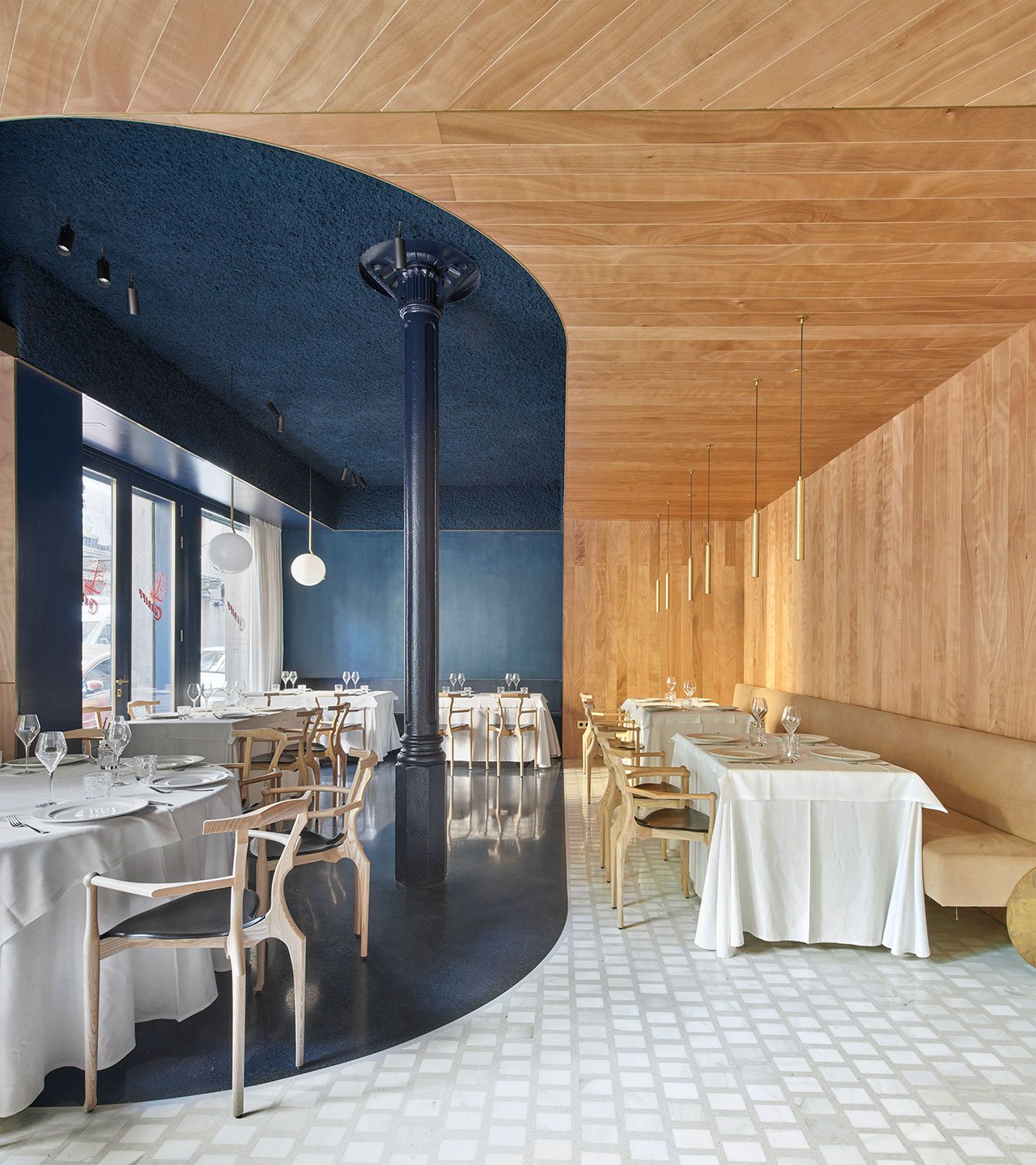 柔和的调色板被各种材料和纹理的海军蓝色大面积大胆刺穿,其圆形轮廓与拱形门口、球形灯和其他圆形细节相呼应。深蓝色的选择暗示了餐厅与地中海的亲密关系,并与木材饰面相结合,唤起了航海的氛围——谢天谢地,无需任何文字参考或海洋图像。就毫不费力地呈现出优雅和俏皮地精致,其核心是“对过去当地渔民的生活以及今天仍在捕捞鱼的人的颂歌”。