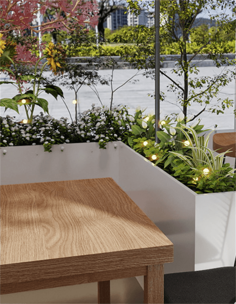 伞棚,是引人停留的一抹温情。有机餐厅的设计考虑着顾客情感的要求,开放包容的外景,是顾客停留的最好招牌。