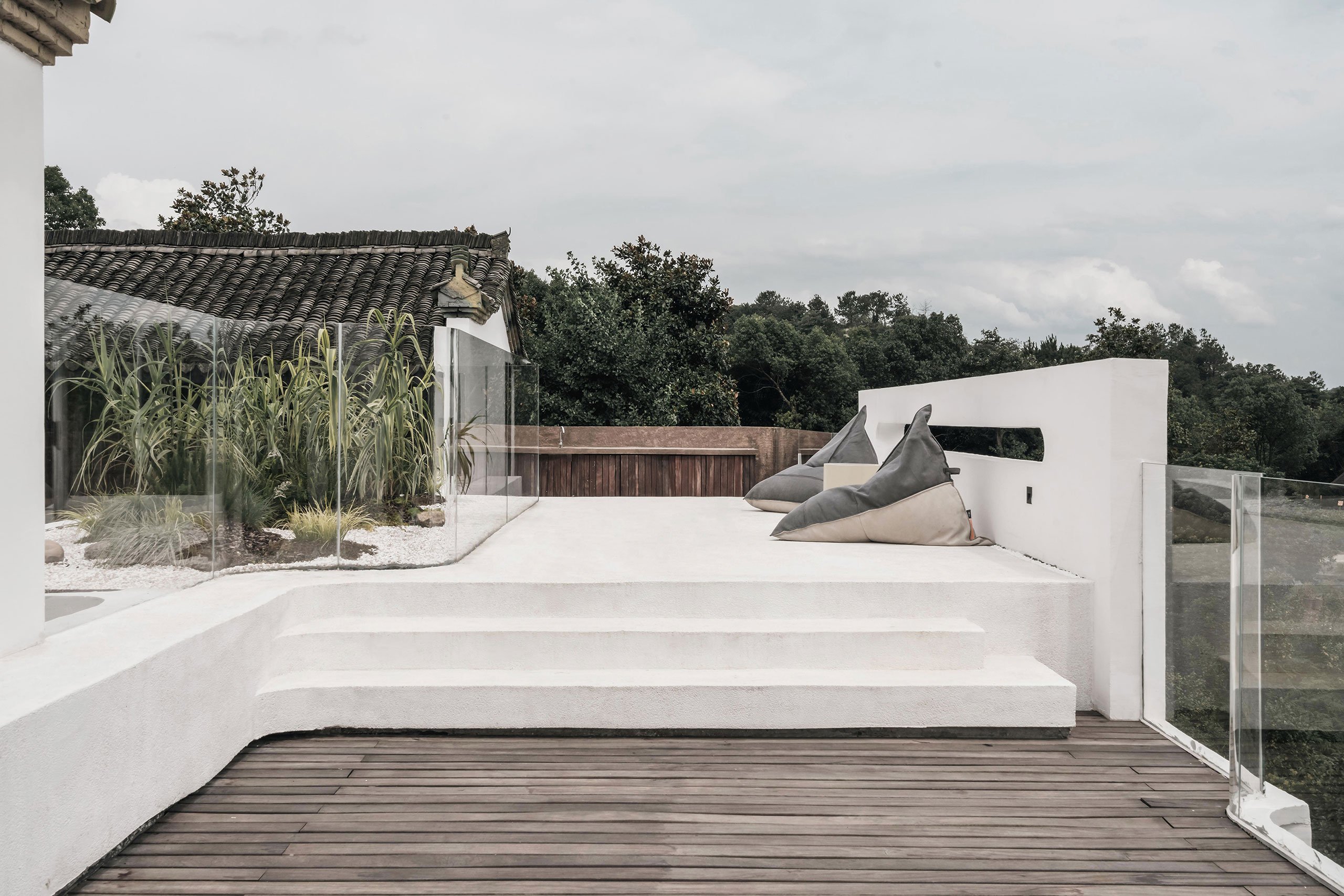 由于一系列当代干预措施,这座翻新的房子非但没有传达出一种古板、博物馆般的感觉,反而有一种新鲜感和现代感。受苏州联合国教科文组织世界遗产地狮子林花园(Lion Grove Garden)的启发,这里有一个极简主义的岩石花园,以迷宫般的太湖石窟而闻名,庭院和中央大厅的一部分集中在两个整体式服务台上,上面挂着一个定制的吊灯,吊灯由一个立方体和球体制成,并连接在一块冰棒状木板上。柜台、枝形吊灯和其他类似设计的家具被雄伟的木结构环绕,以其简洁的几何形状、圆角和白色脱颖而出,花园中的野生植被、岩石和鹅卵石为古今元素提供了缓冲。围绕花园周围餐饮区的落地玻璃,包括中央大厅对面的现代扩建部分,使每张桌子都能感受到古老的结构和岩石花园,同时模糊了室内和室外的界限。过多的豆袋让游客们可以舒适地欣赏改造后的建筑,而在室外,一个为户外用餐而设计的露台可以看到周围的山脉。