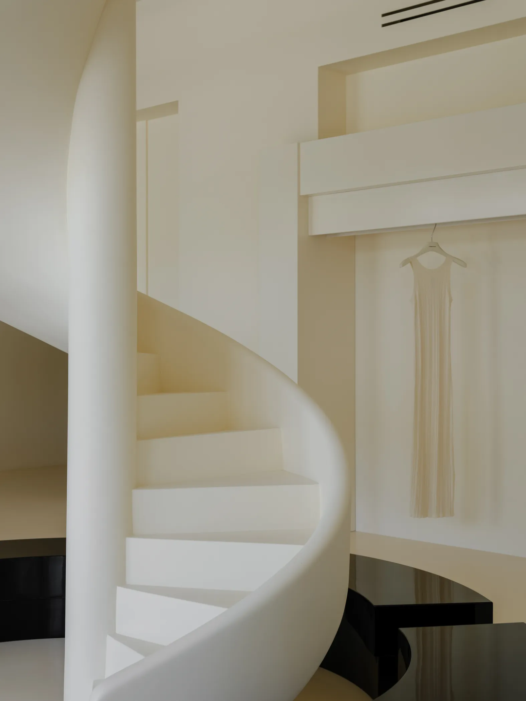 位于中心的白色螺旋楼梯,不是为了贯通上下层,而是一种独特的空间设计,以帮助产品更好地展现。光滑的材料表面与纯白色调相结合,给人牛奶般的流动与丝滑感,与设计师总体理念相匹配。