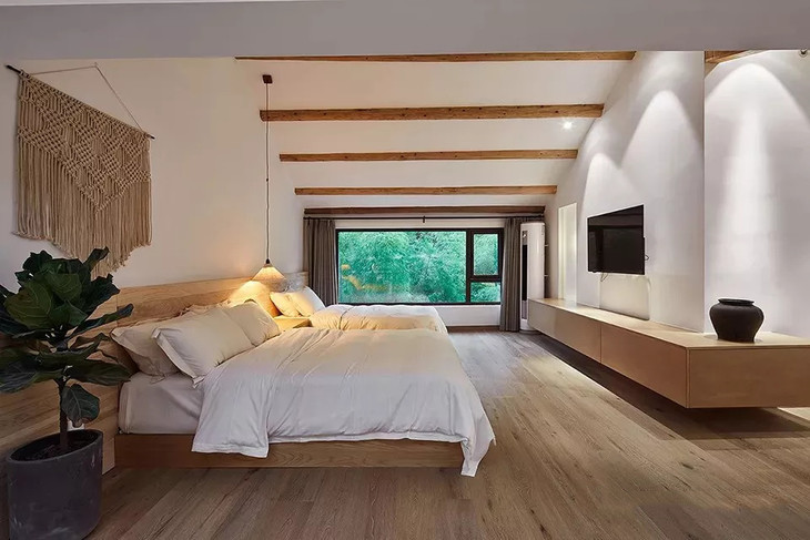 房间的设计将白墙与木质材料相结合,将空间变得自然纯粹,配以现代化简约的装饰,以黄铜材质家具为点缀,映出低调与雅奢,提升室内的整体气质。